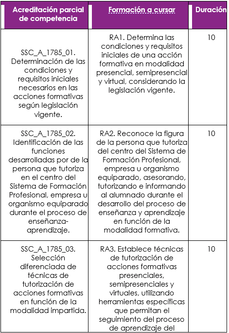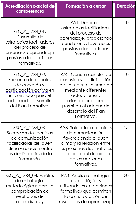 Incluye ofertas que permiten adquirir unidades de competencia vinculadas a la docencia en FP, facilitando itinerarios progresivos hacia el Certificado completo (Grado C).